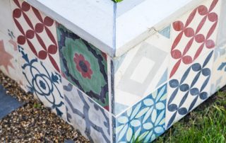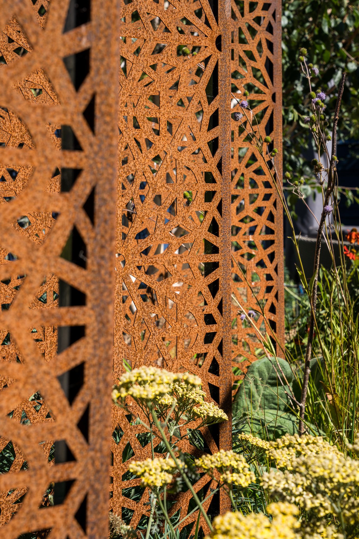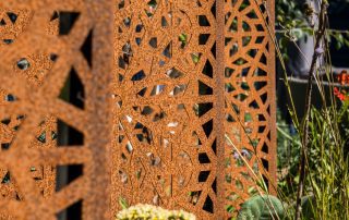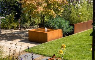 The layout of the garden will be orientated at a 45° angle to the house/boundaries to create the illusion of greater width and depth. Directly outside the back door a concrete block raised bed clad with decorative encaustic tiles will serve as a focal point from the house and add year round colour to the garden. To the front of the raised bed will be a porcelain patio adjoining the house, from which two porcelain tiled pathways will lead down the garden. The left-hand pathway will pass beneath two black powder coated steel arches and step down to join a large porcelain patio in the bottom left corner of the space. To the left of the path will be a deep planting bed with several corten weathered steel decorative screens installed along the fence line. Trees will be planted along the rear boundary to improve screening and privacy. A corten steel water table and large corten steel cube planter will create a focal point.