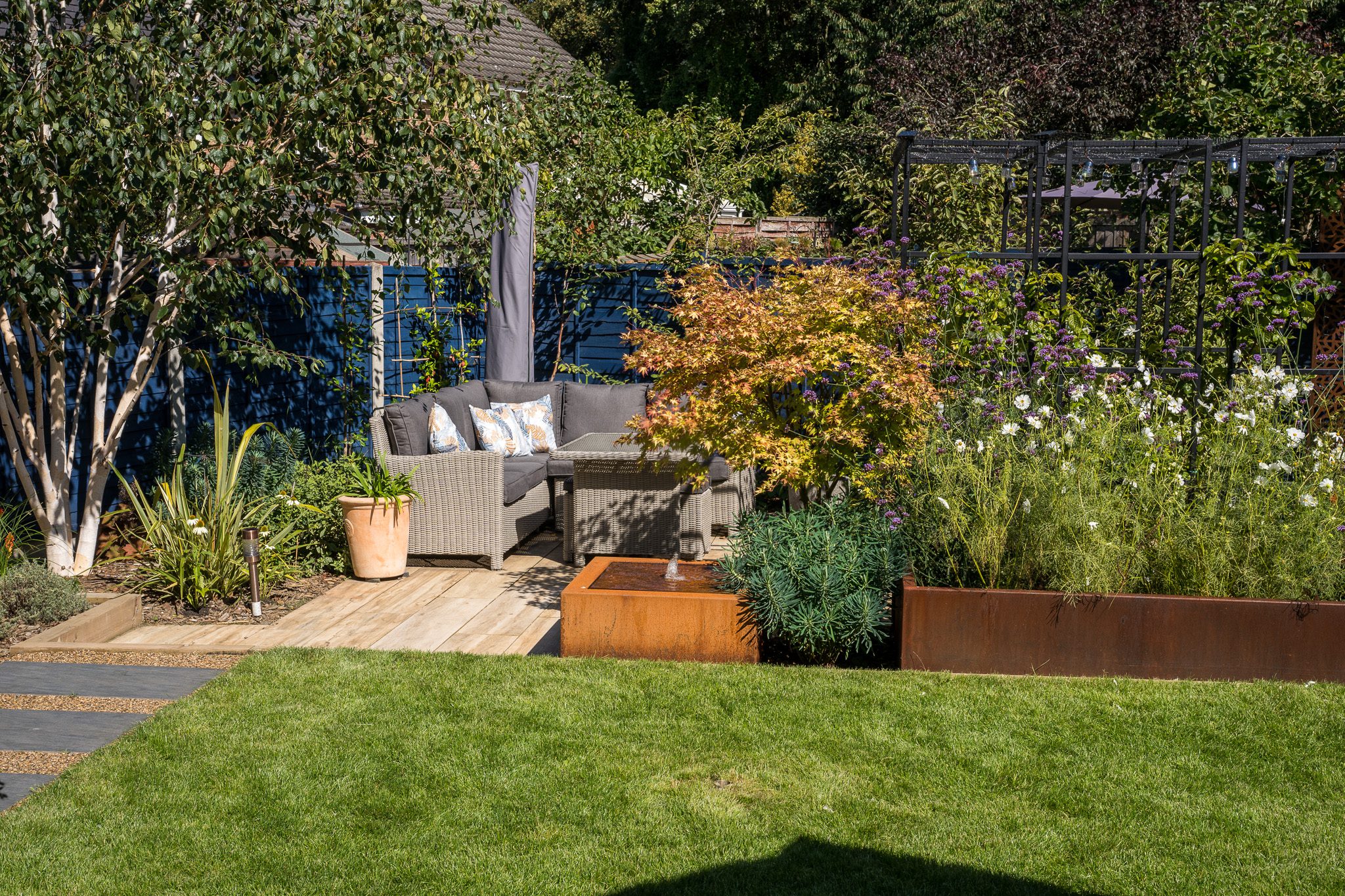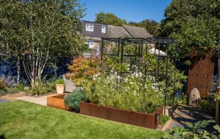 A path will lead from the main patio towards the back right corner of the space, passing beneath three black steel arches and then turning right to lead back towards the house. To the right of this path will be a ‘grow your own’ area comprising a greenhouse, three large railway sleeper raised beds and a compost and water butt. The pathway will continue and terminate at the small patio adjoining the house. The centre of the garden will feature a small lawn.