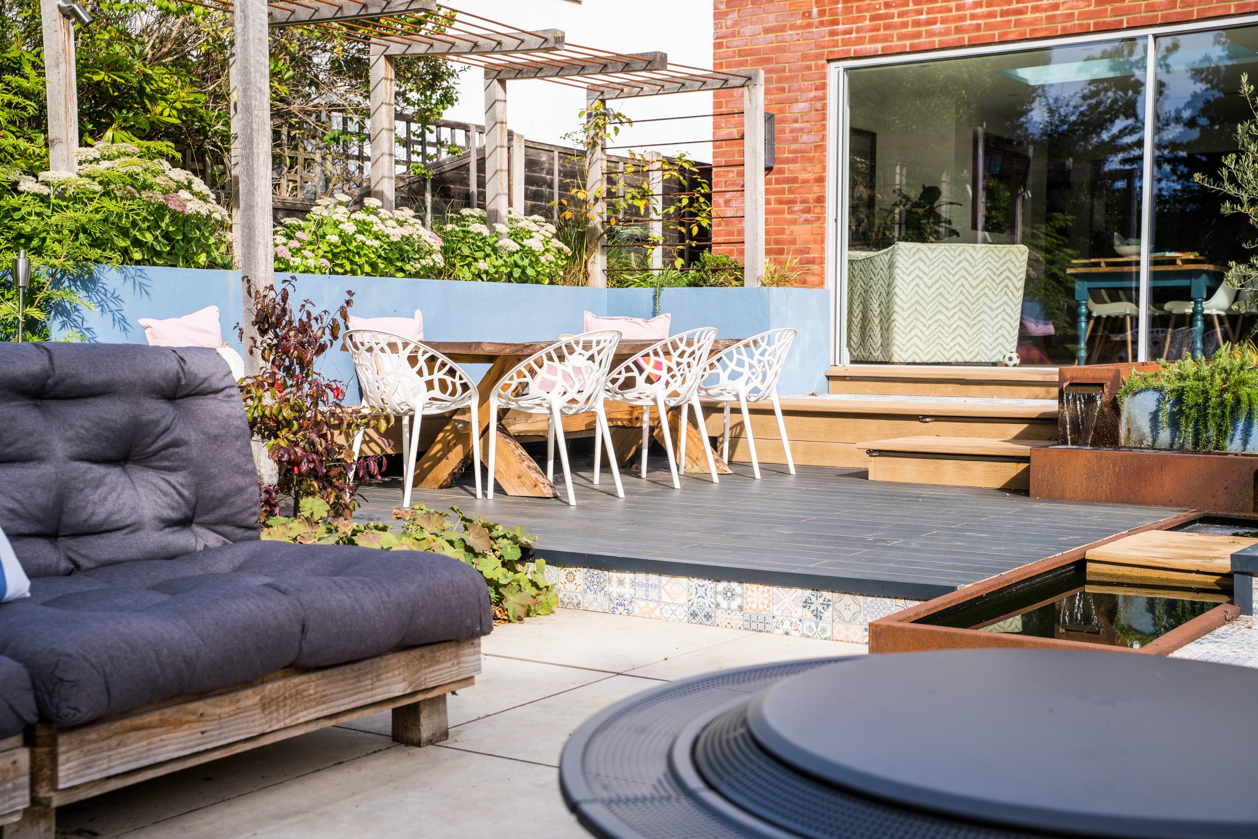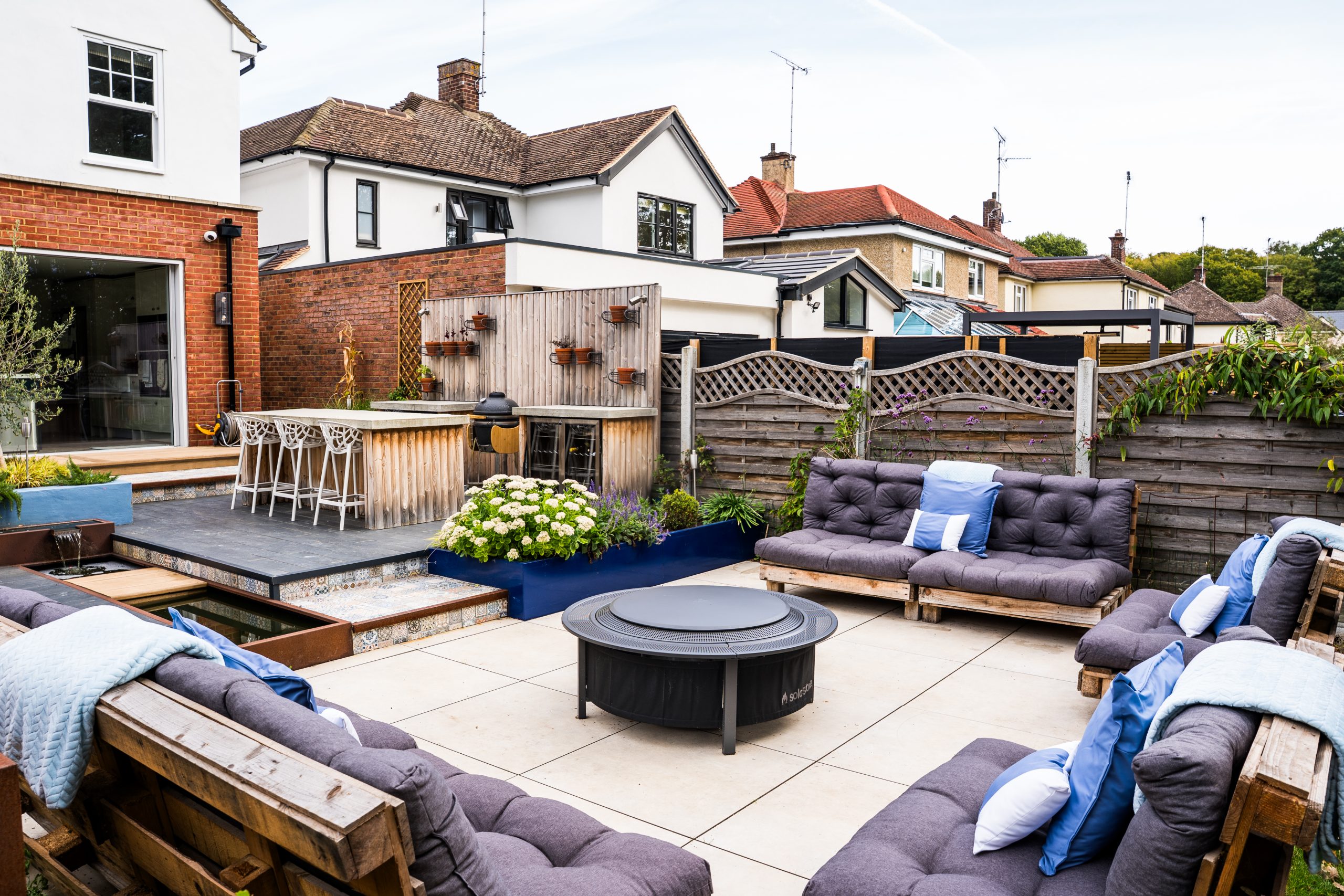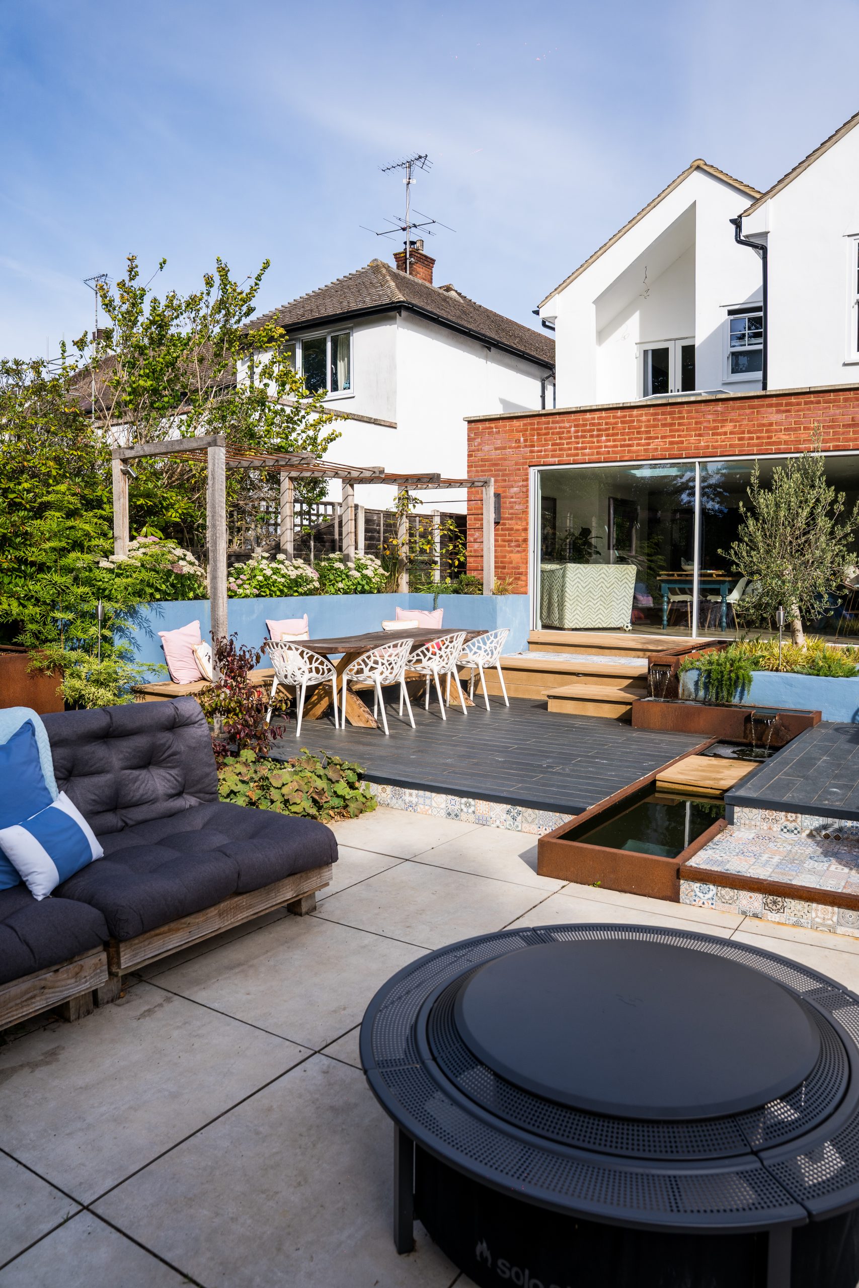 To the right-hand side, steps lead down to a stunning patio framed by raised beds and a bespoke water feature. This patio is spacious enough to host a dining table with fixed bench seating, making it perfect for al fresco meals and family gatherings.