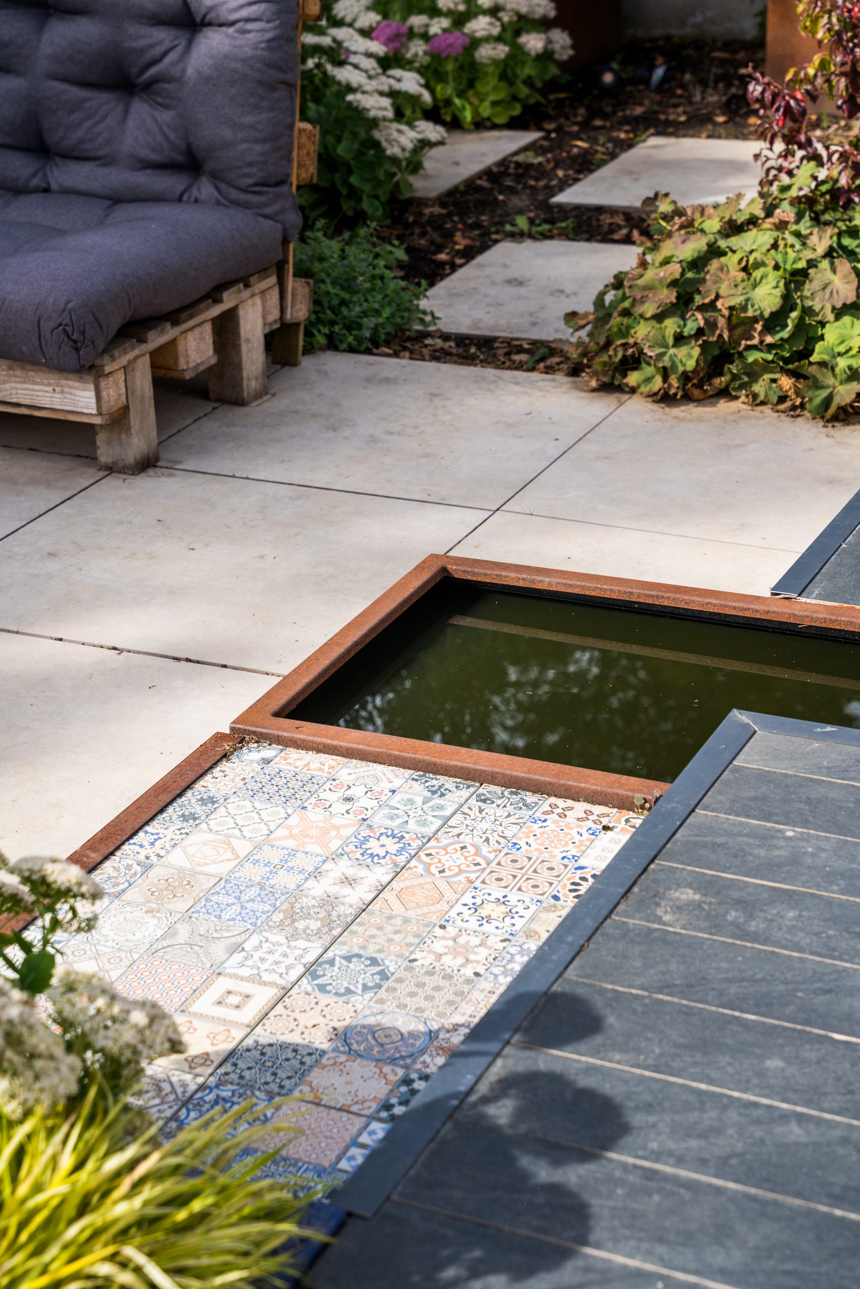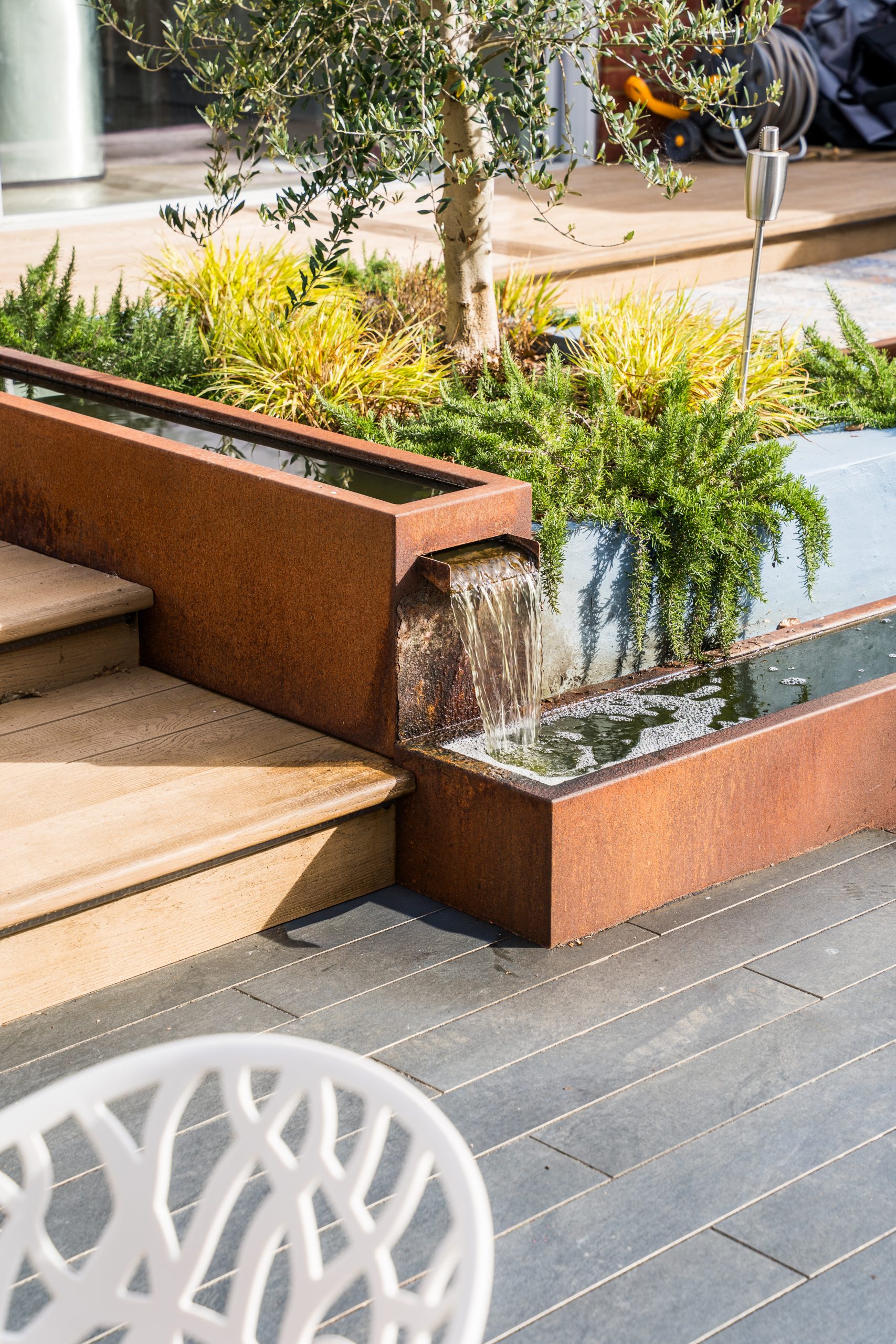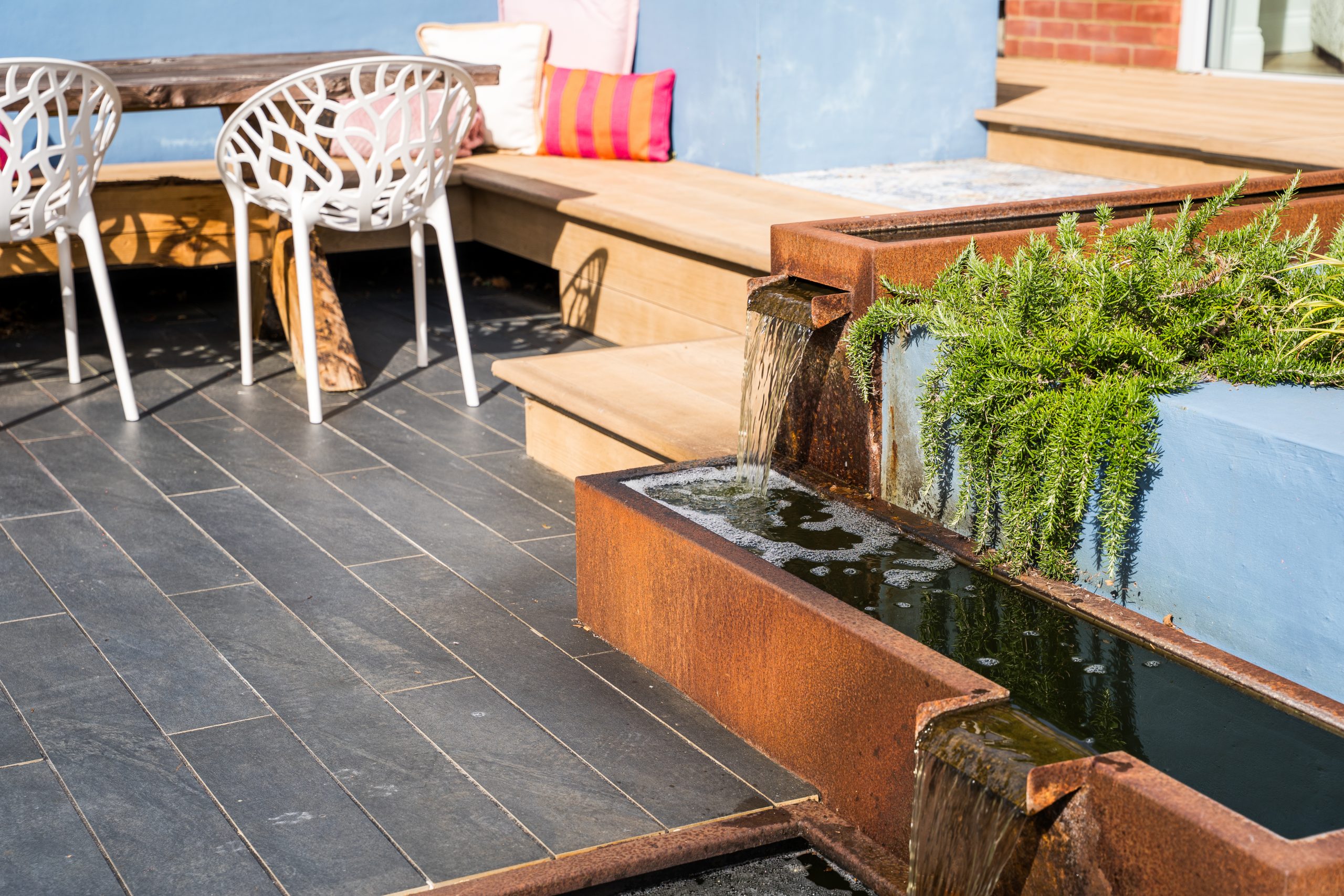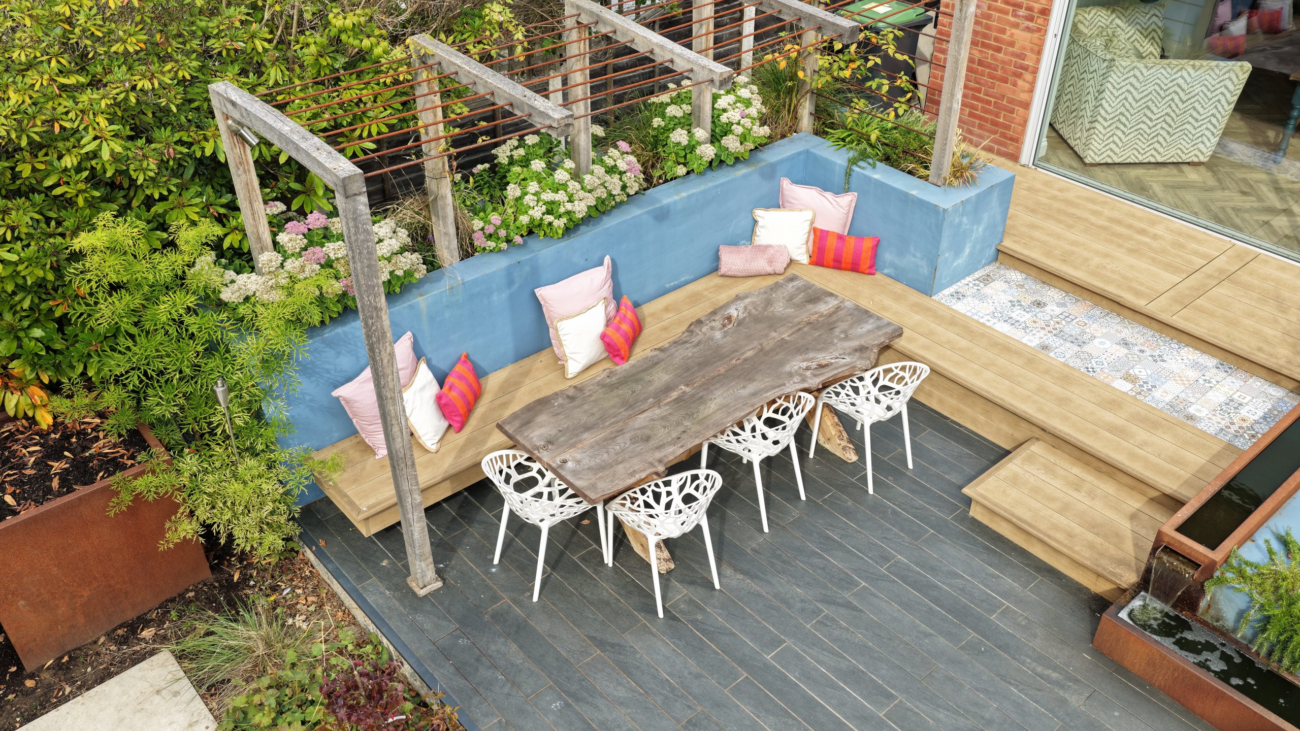 To the right-hand side, steps lead down to a stunning patio framed by raised beds and a bespoke water feature. This patio is spacious enough to host a dining table with fixed bench seating, making it perfect for al fresco meals and family gatherings.