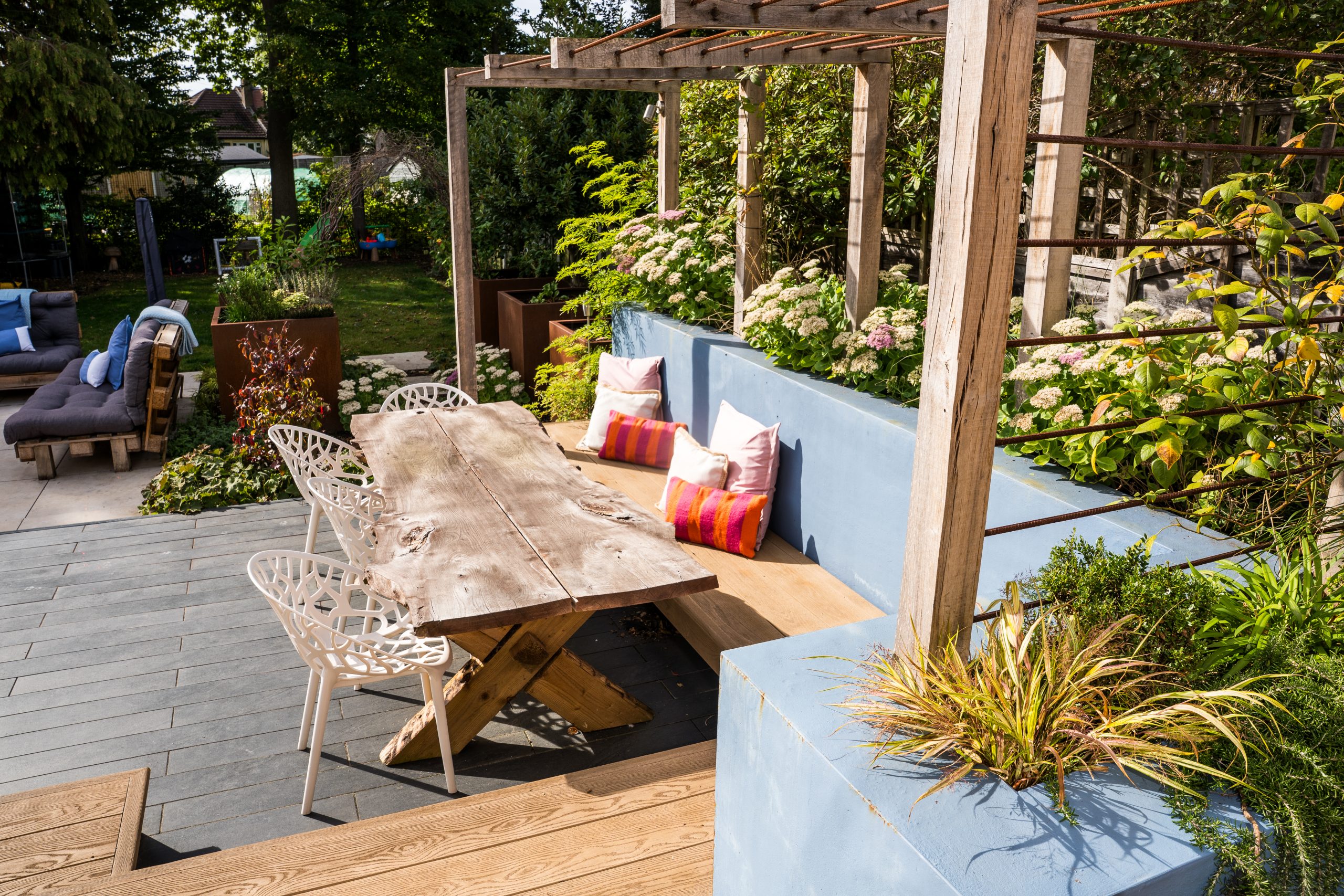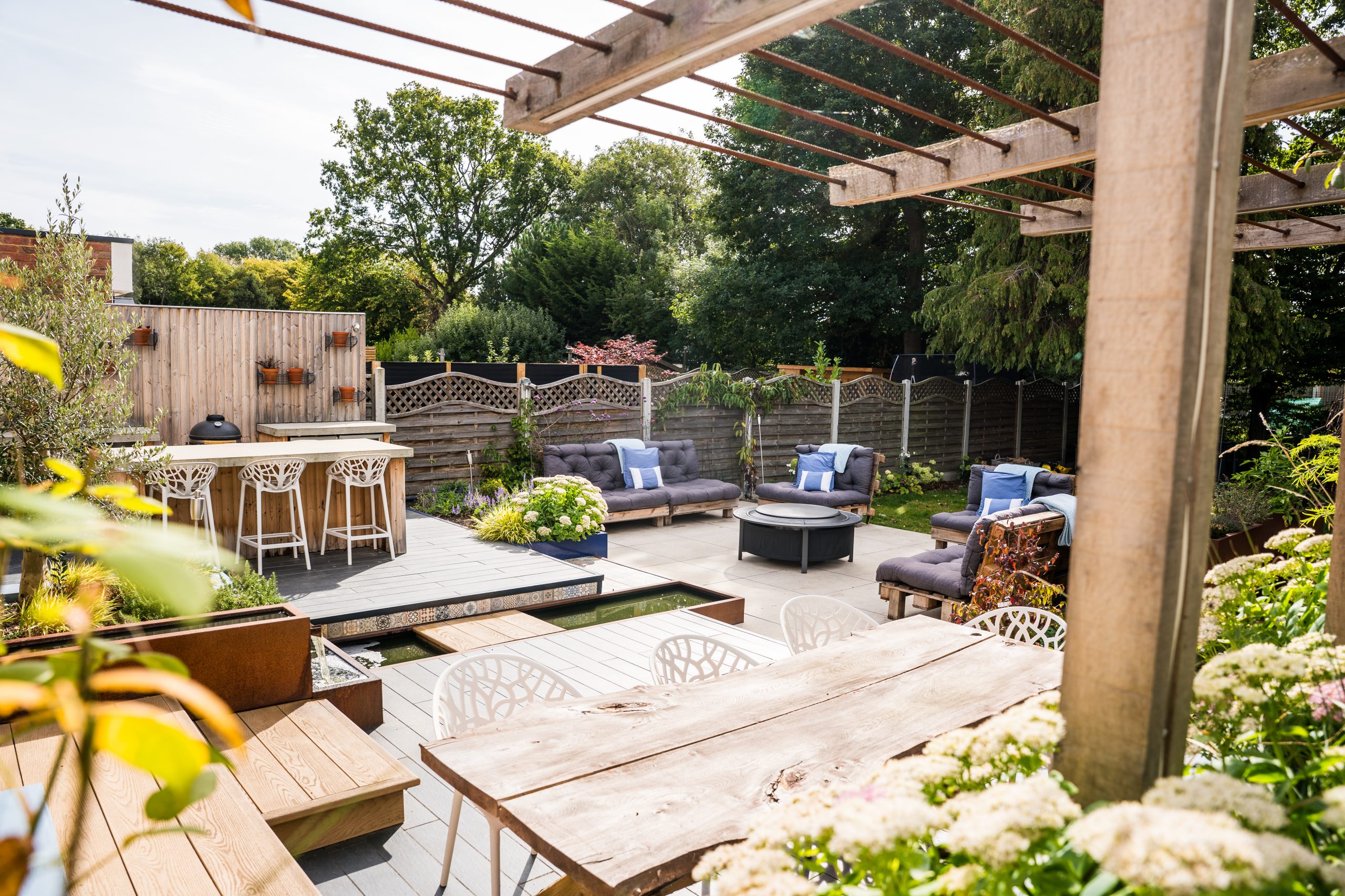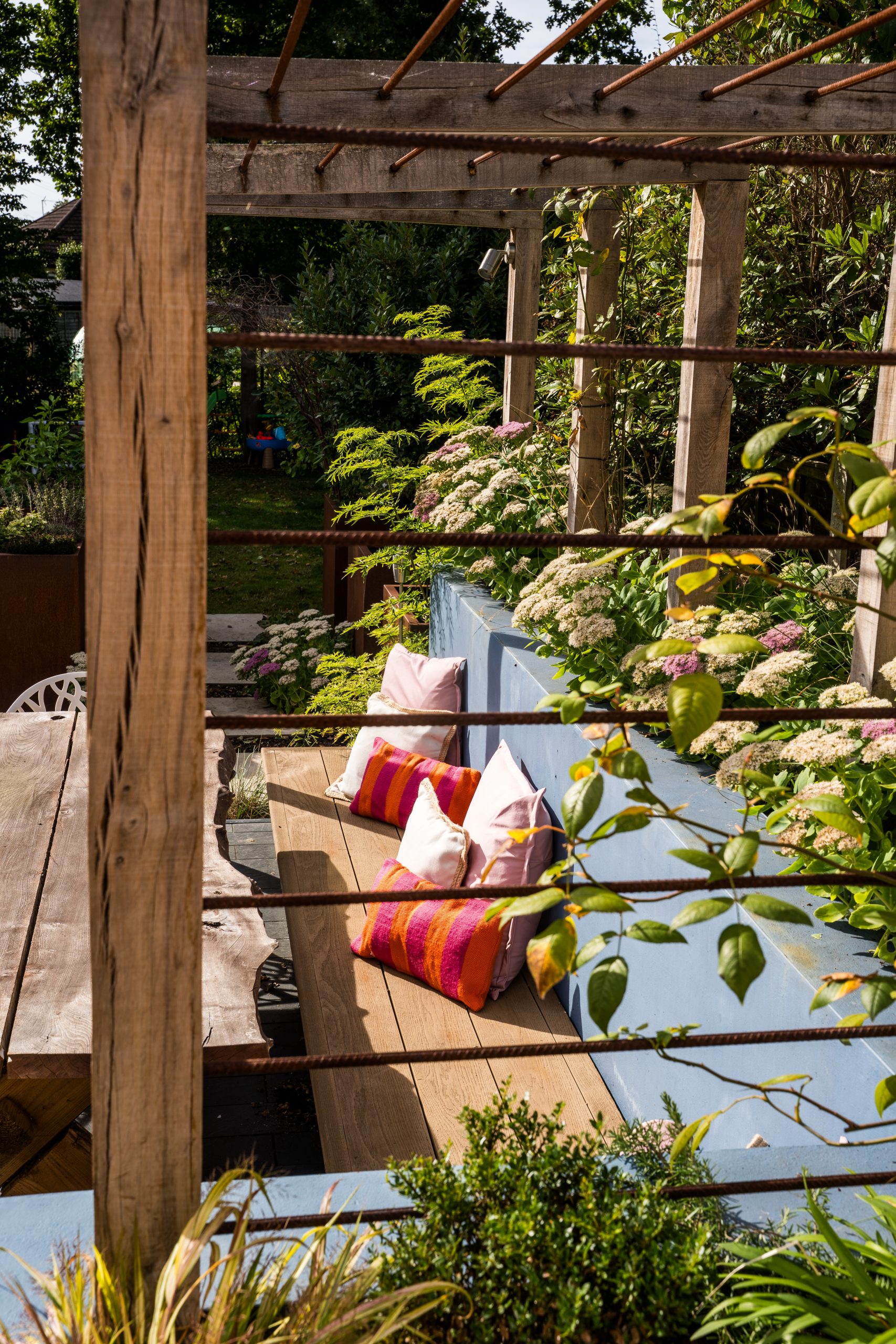 Above this area, a custom-built pergola made from hardwood timber and steel tubing will offer shade and privacy, with climbing plants softening the structure over time and enhancing the garden’s natural charm.