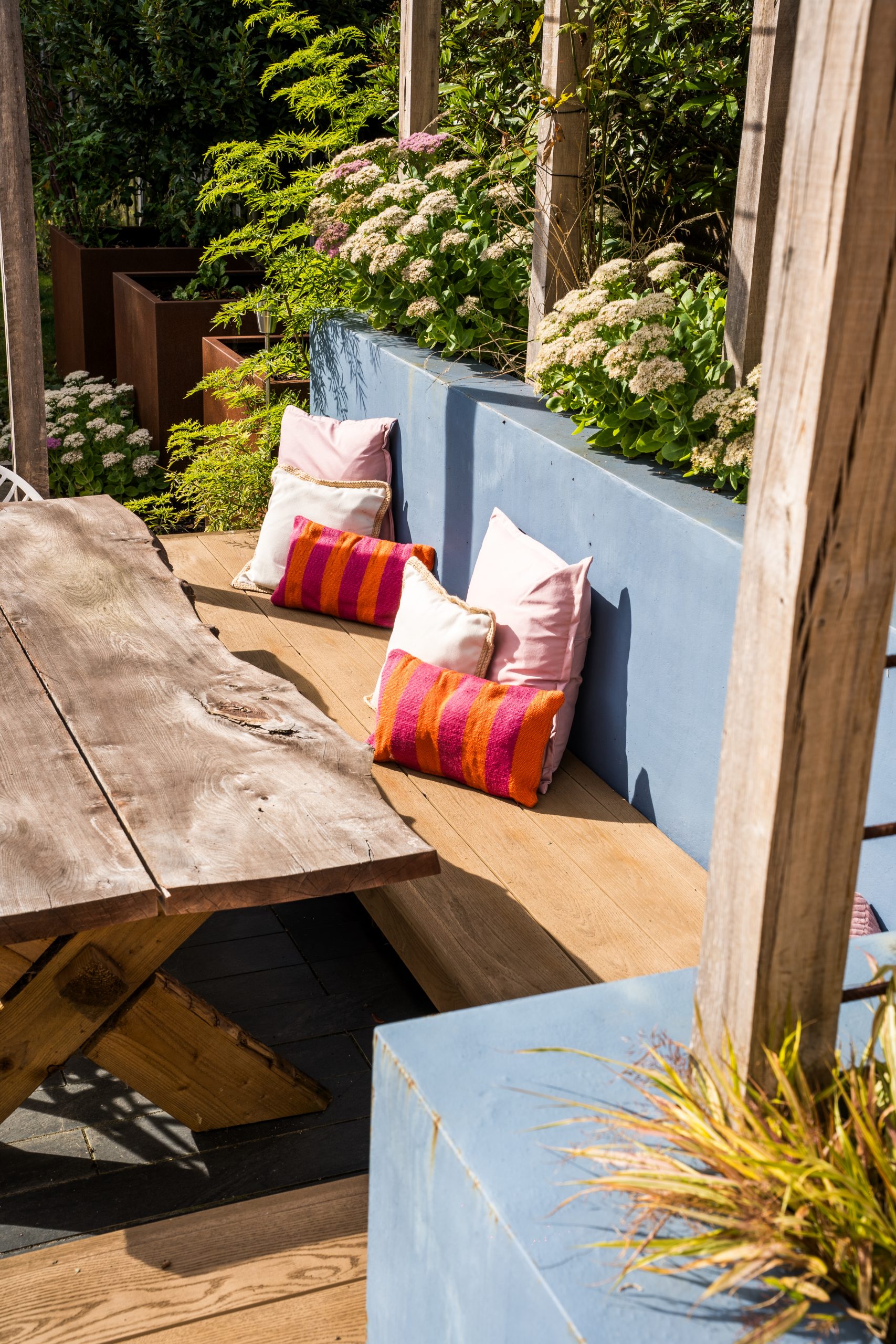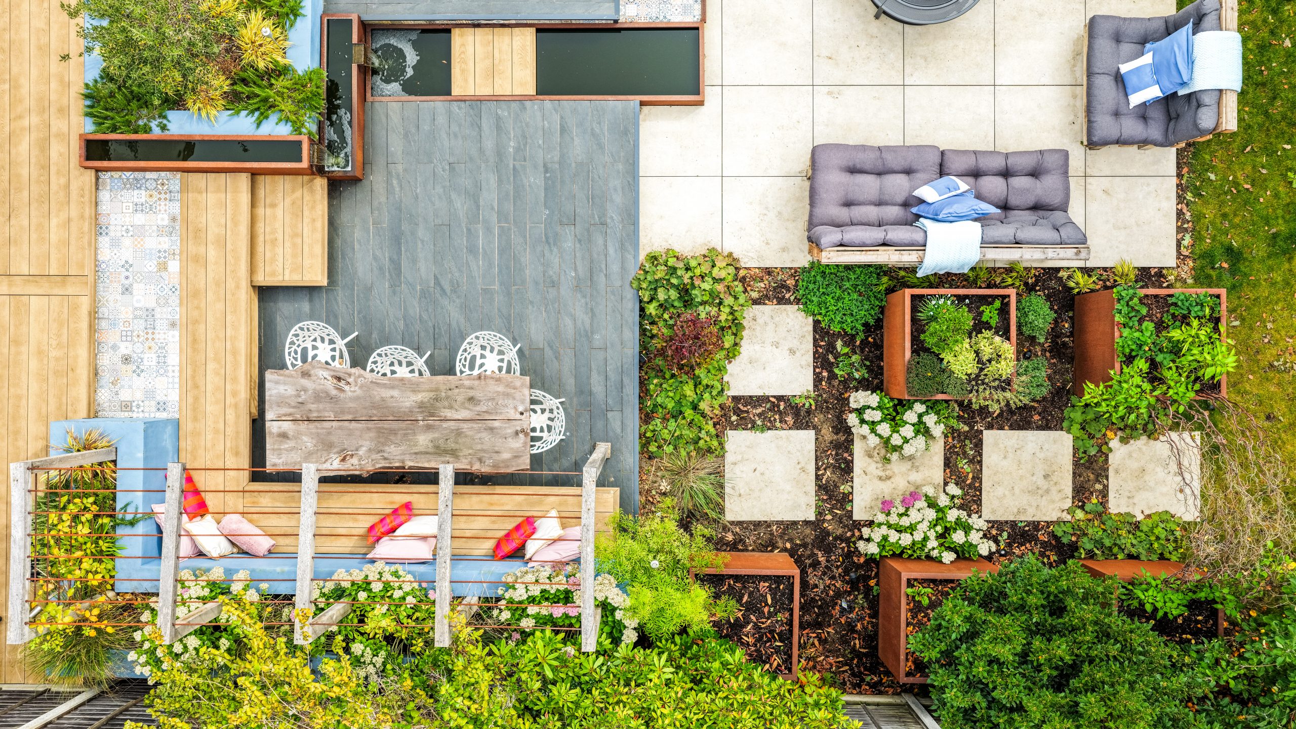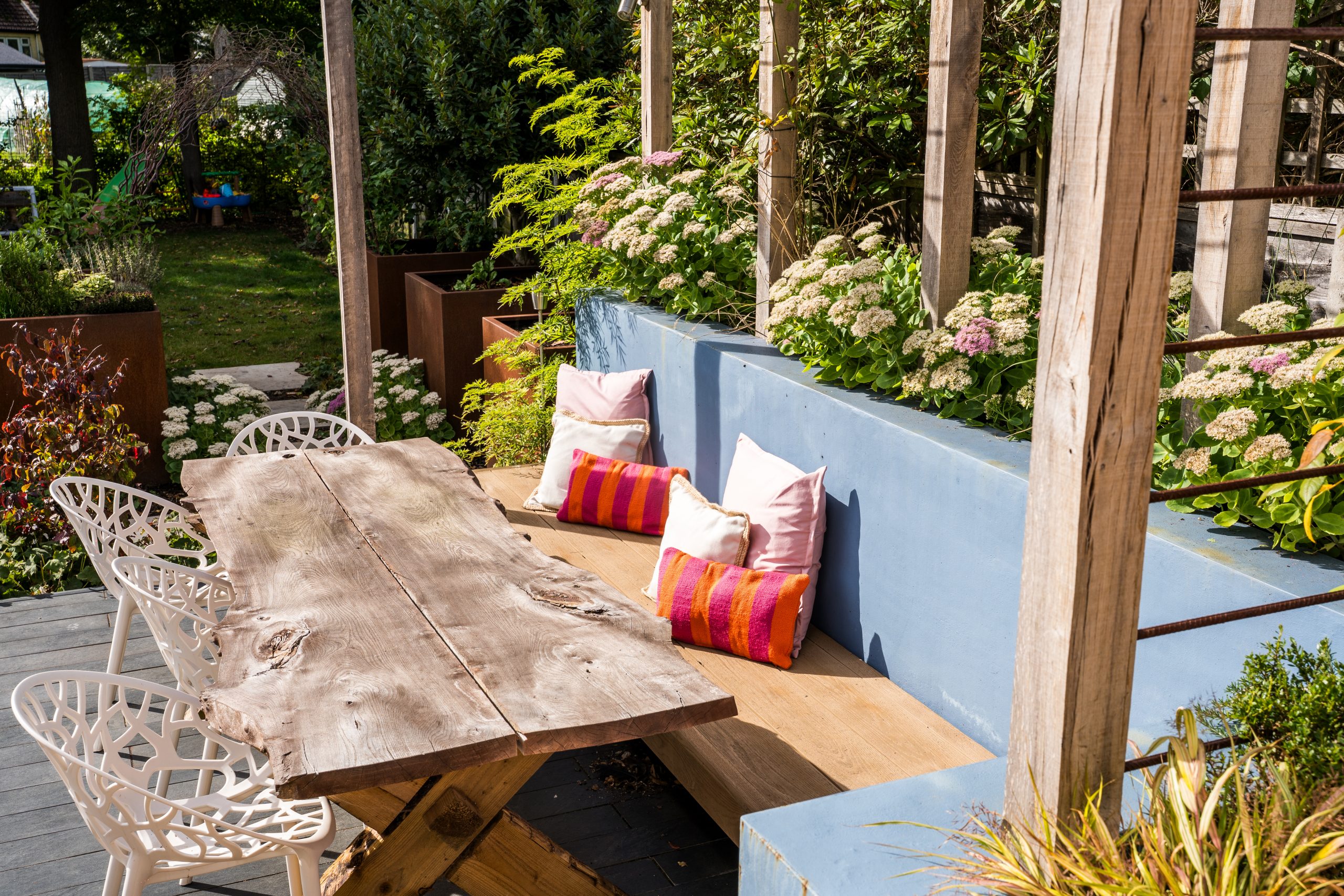 Above this area, a custom-built pergola made from hardwood timber and steel tubing will offer shade and privacy, with climbing plants softening the structure over time and enhancing the garden’s natural charm.