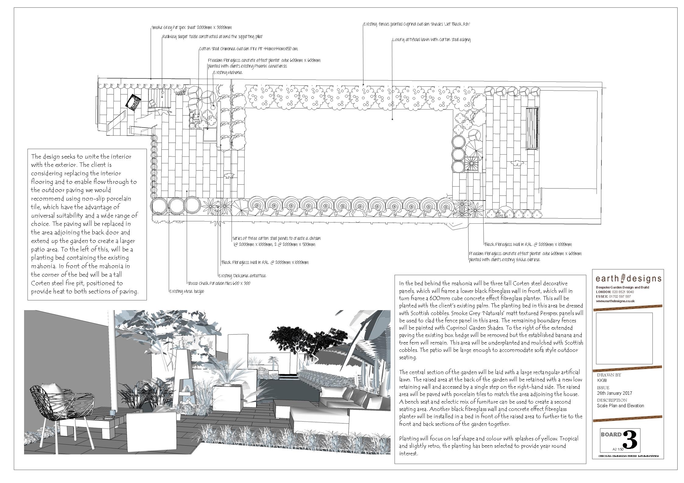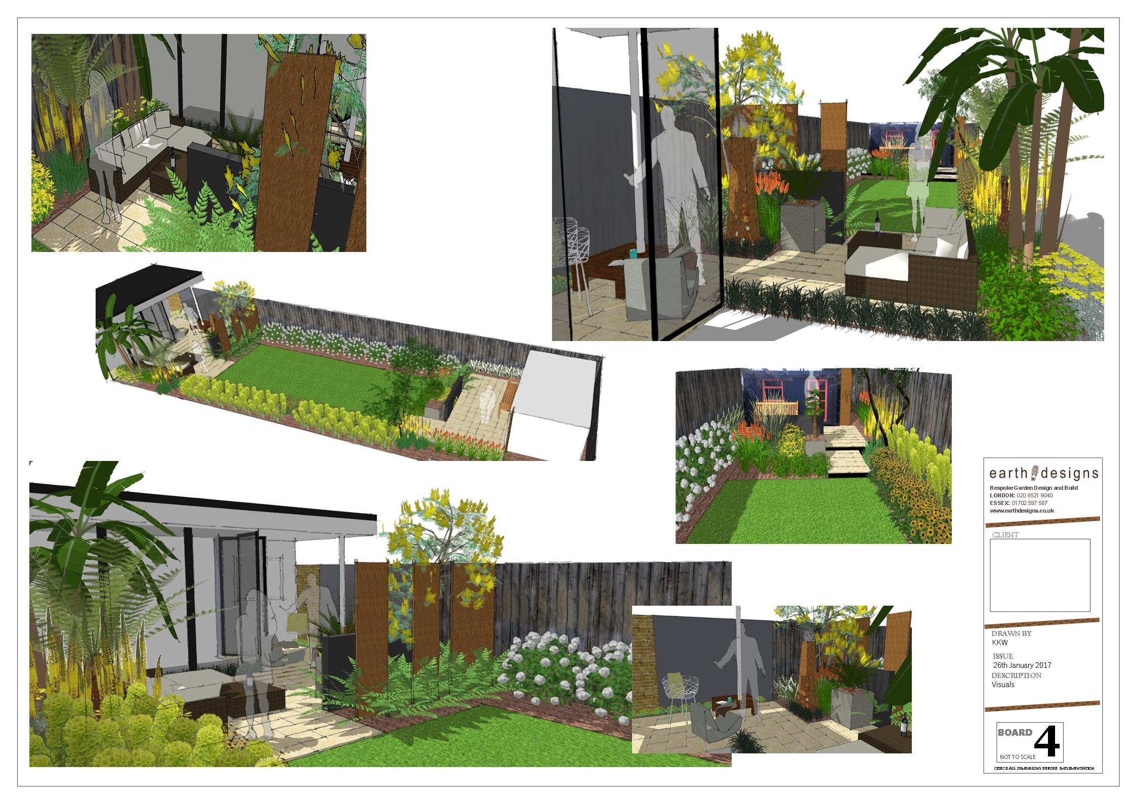 Initial sketches explored how to make the most of the existing levels and retain key plants while modernising the overall space. These visuals helped refine the flow between the lower patio, central lawn and the raised upper seating area. The concept drawings also established the placement of Corten steel elements and textured boundary cladding to create a cohesive design from front to back.