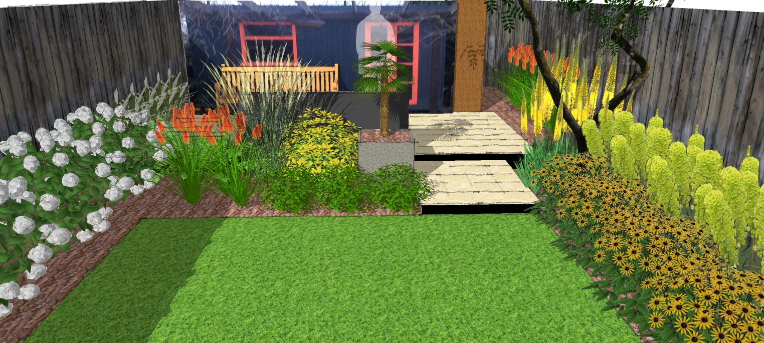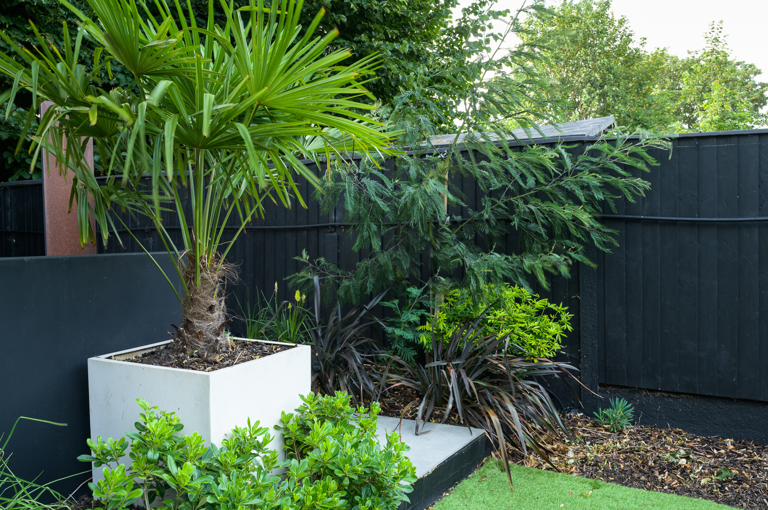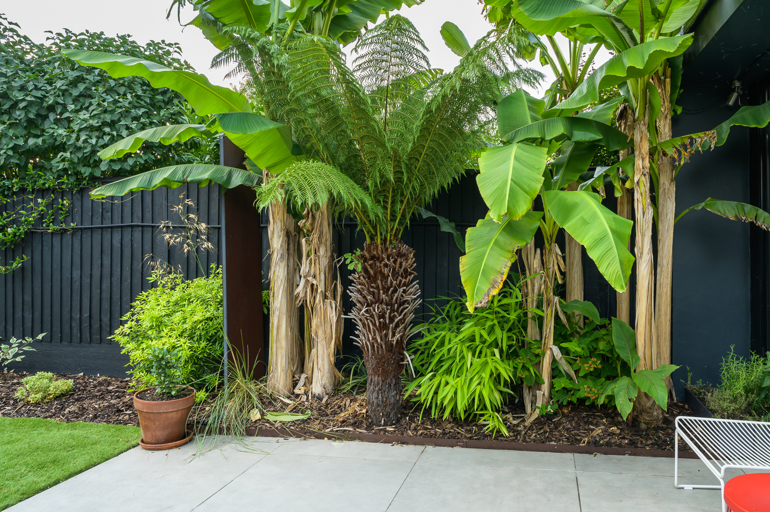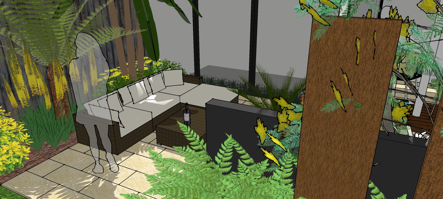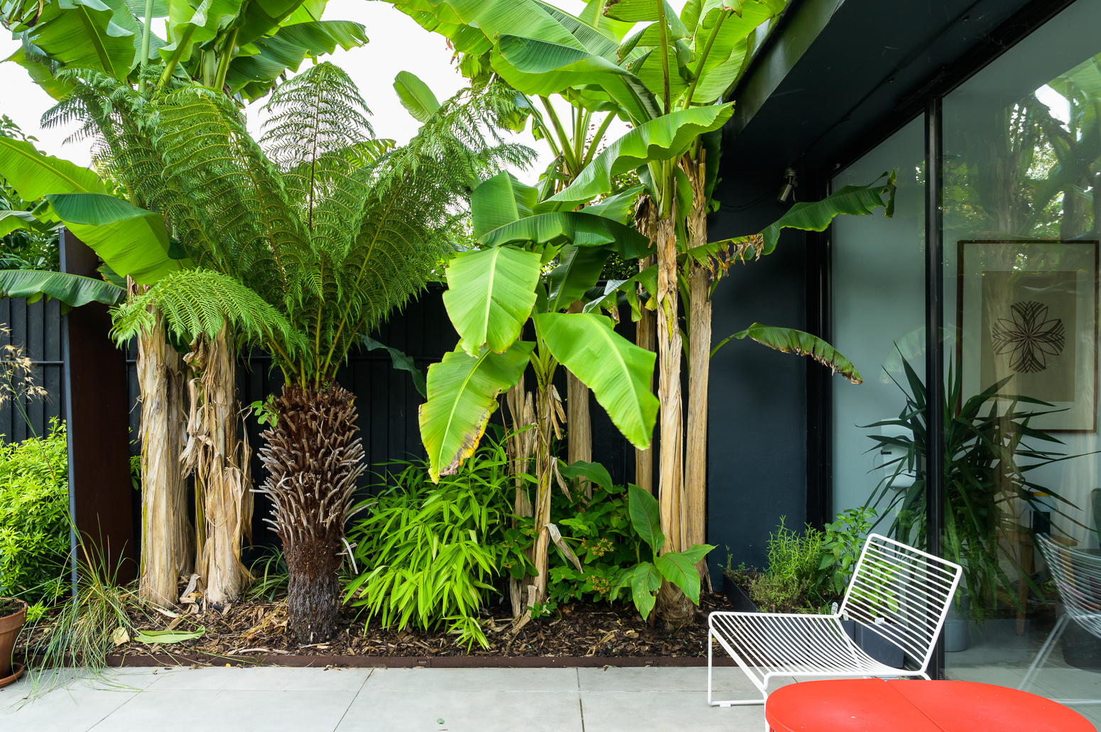 Planting will focus on leaf shape and colour with splashes of yellow. Tropical and slightly retro, the planting has been selected to provide year-round interest and complement both the established shrubs and the new hard landscaping.