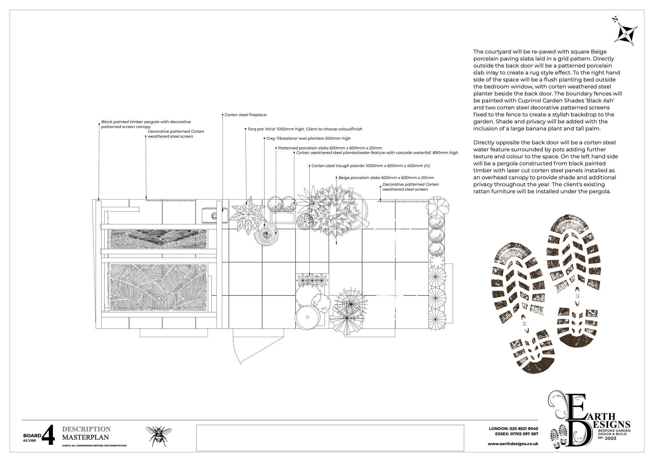 The courtyard will be re-paved with square Beige porcelain paving slabs laid in a grid pattern. Directly outside the back door will be a patterned porcelain slab inlay to create a rug style effect. To the right hand side of the space will be a flush planting bed outside the bedroom window, with corten weathered steel planter beside the back door. The boundary fences will be painted with Cuprinol Garden Shades ‘Black Ash’ and two corten steel decorative patterned screens fixed to the fence to create a stylish backdrop to the garden. Shade and privacy will be added with the inclusion of a large banana plant and tall palm.