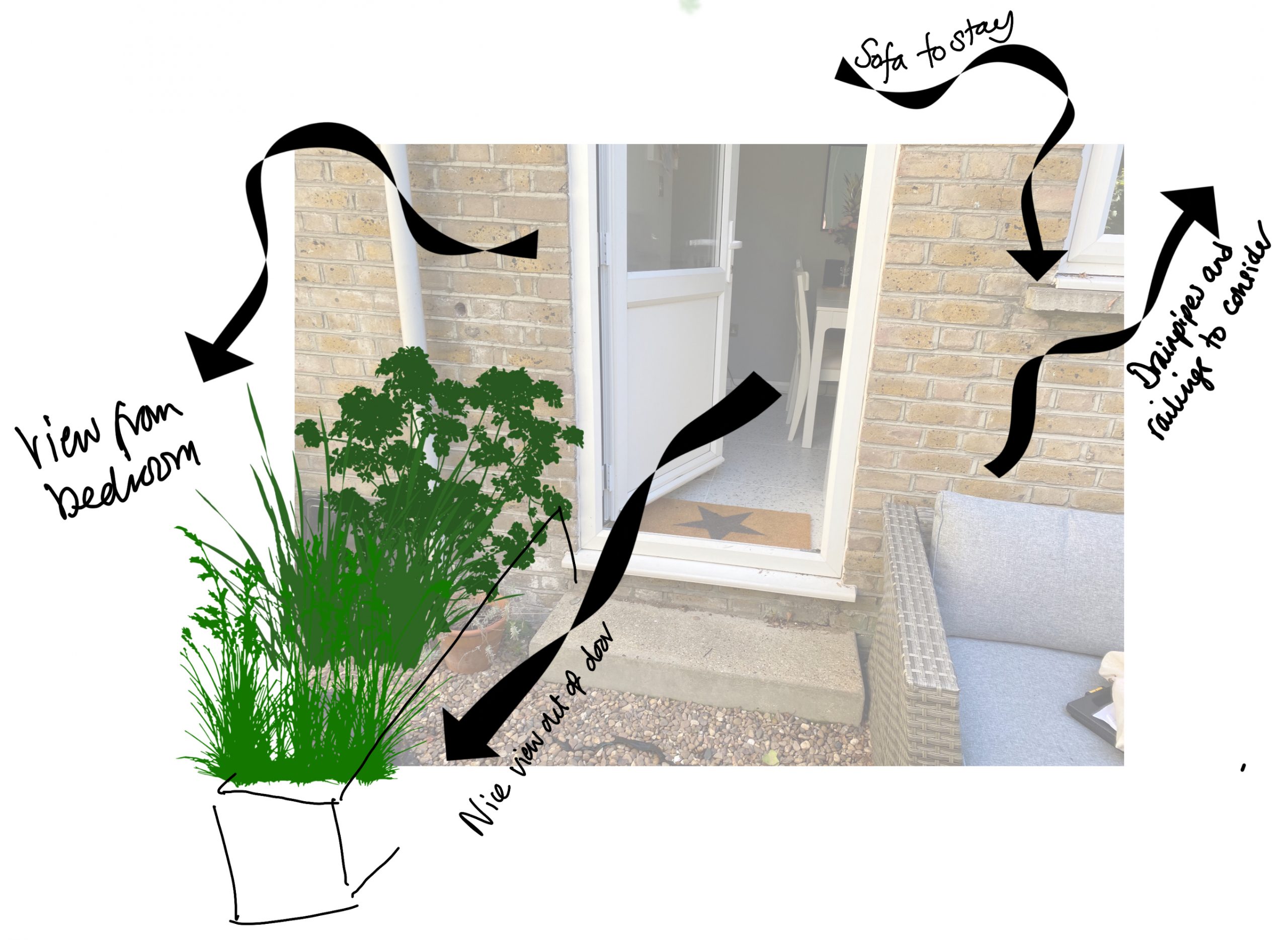 This small sunny courtyard is very overlooked so needs some privacy. It needs more greenery and a low maintenance design. The client will make most use of it during the sunnier months but would also like it to be useable during the winter. They would like to keep the existing furniture if possible.
