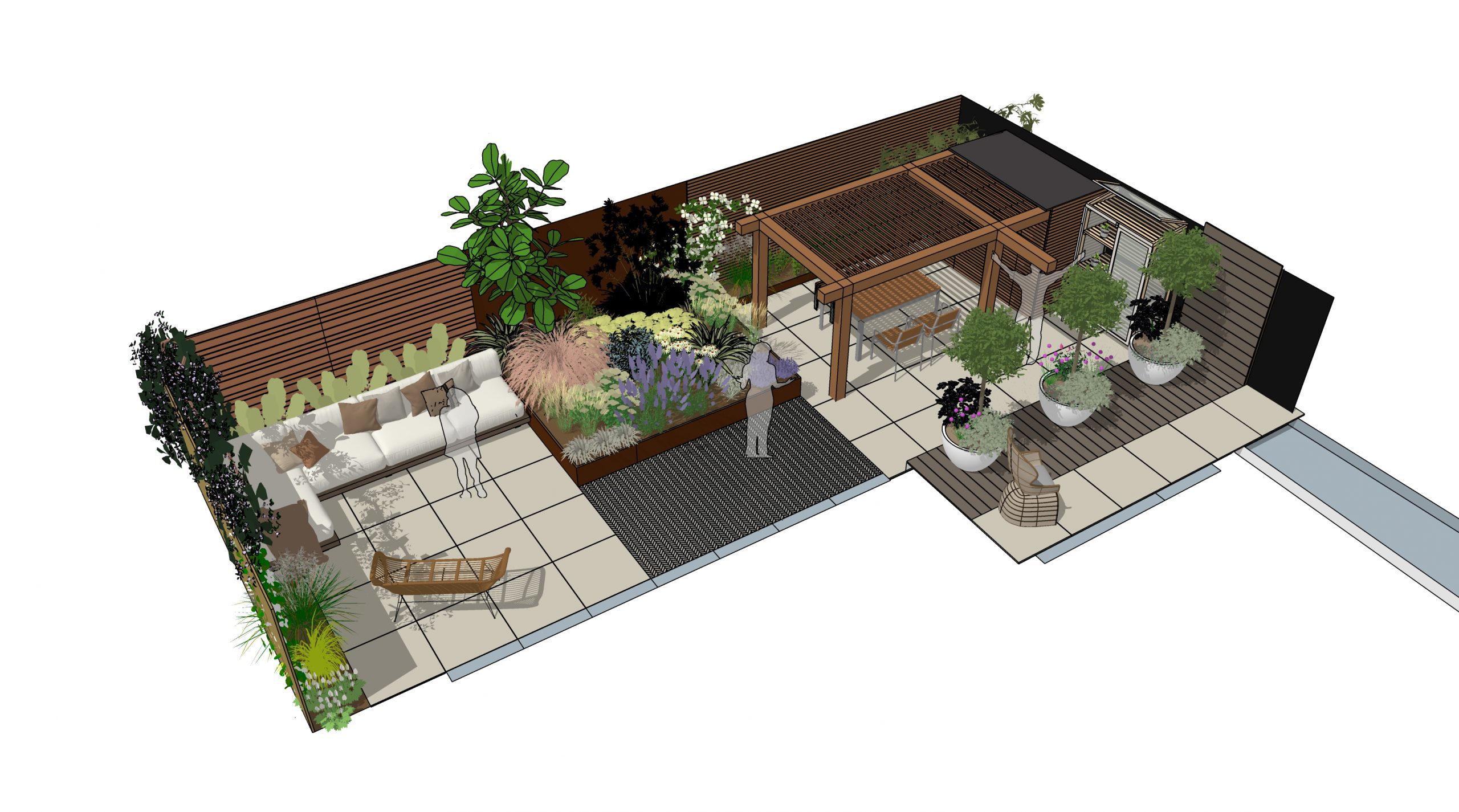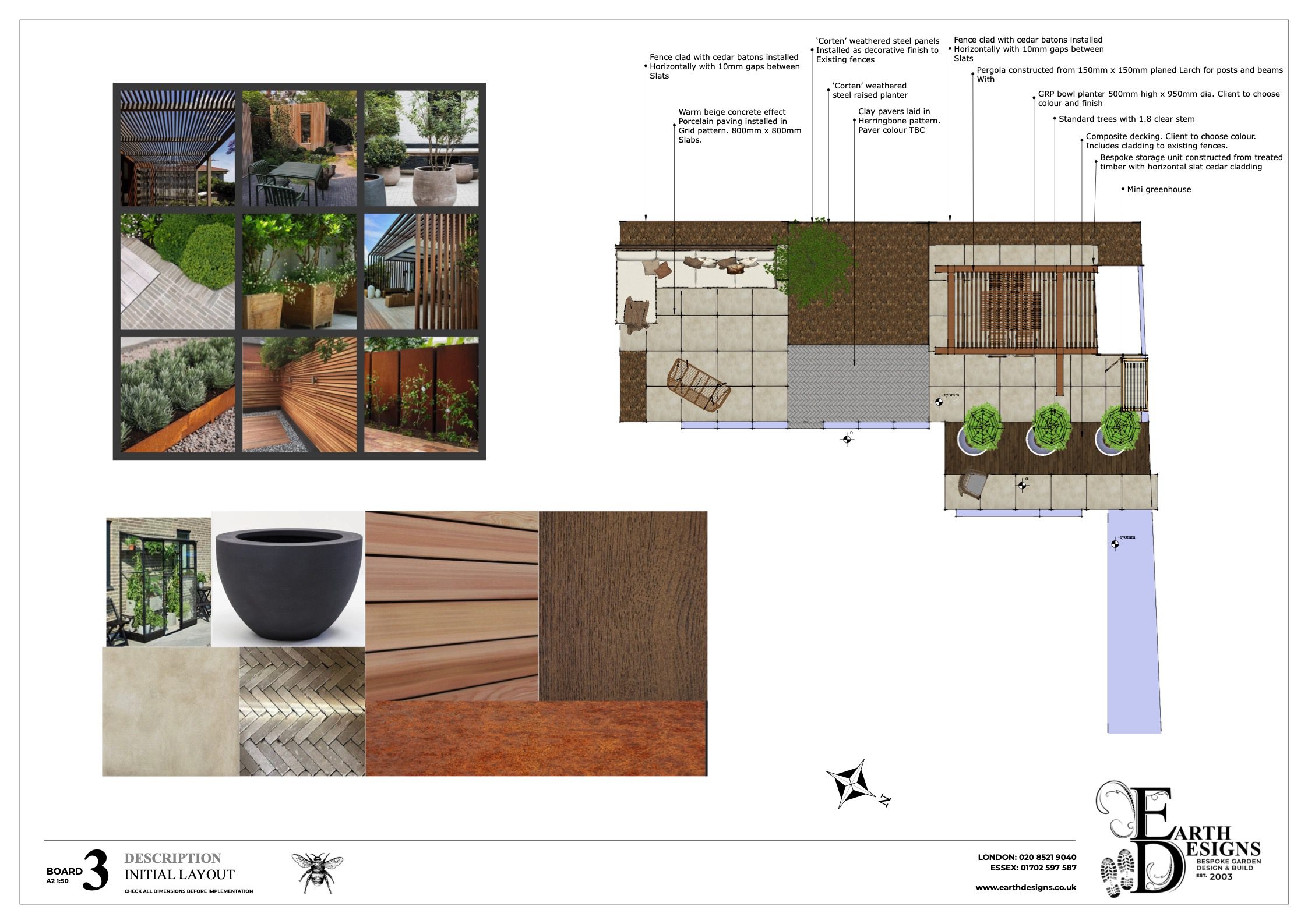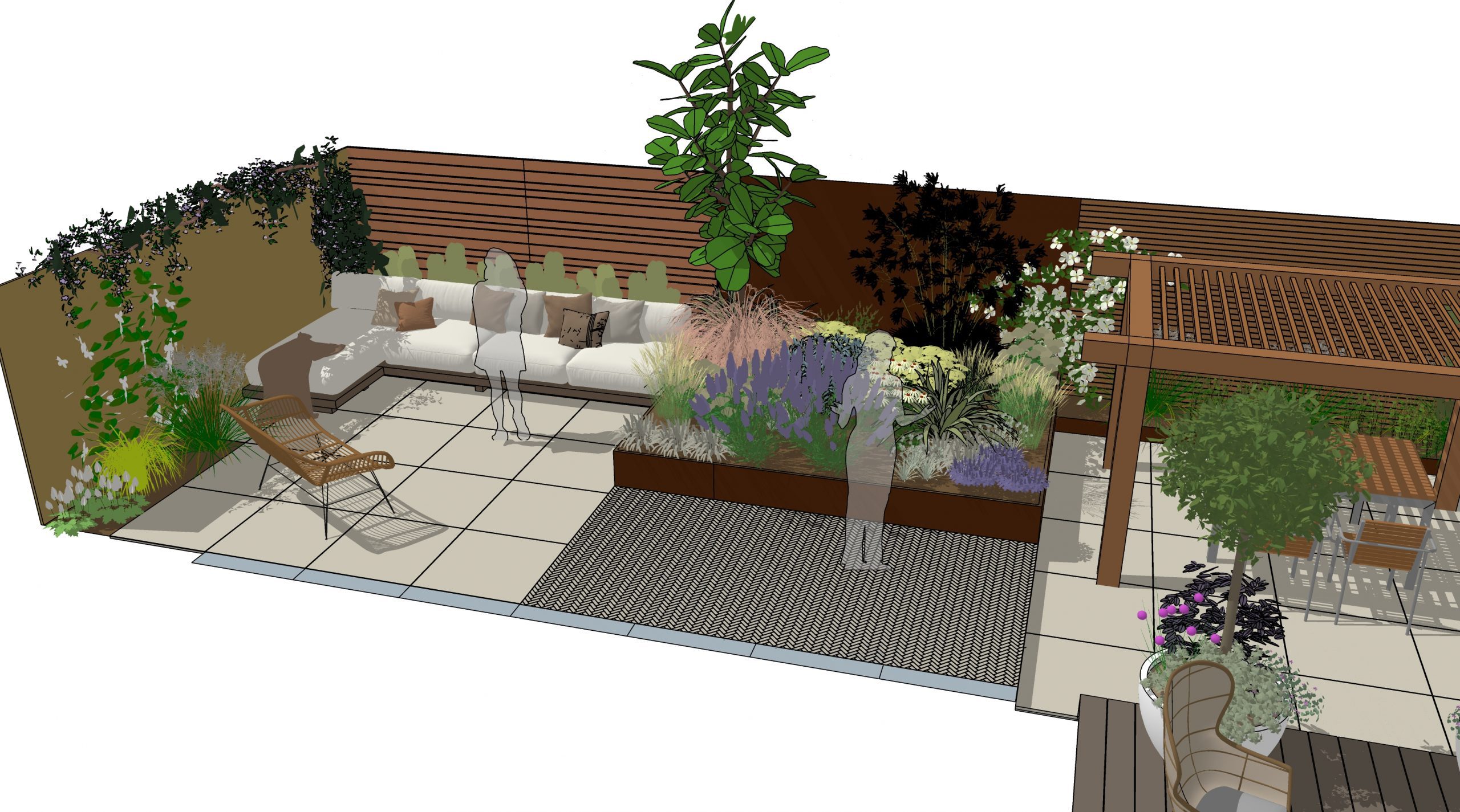 To the left of this unit, closer to the house, will be a tall toughened glass lean-to greenhouse to allow for a bit of grow-your-own gardening. A decorative inlay of ‘Coppered Oak’ composite decking will run parallel to the house in the side return, and continue up the wall to create a focal point. The decking strip will feature three large pots planted with standard bay trees and a variety of culinary herbs. The rear boundary fences will be clad with a mixture of slatted cedar screens and Corten steel panels.